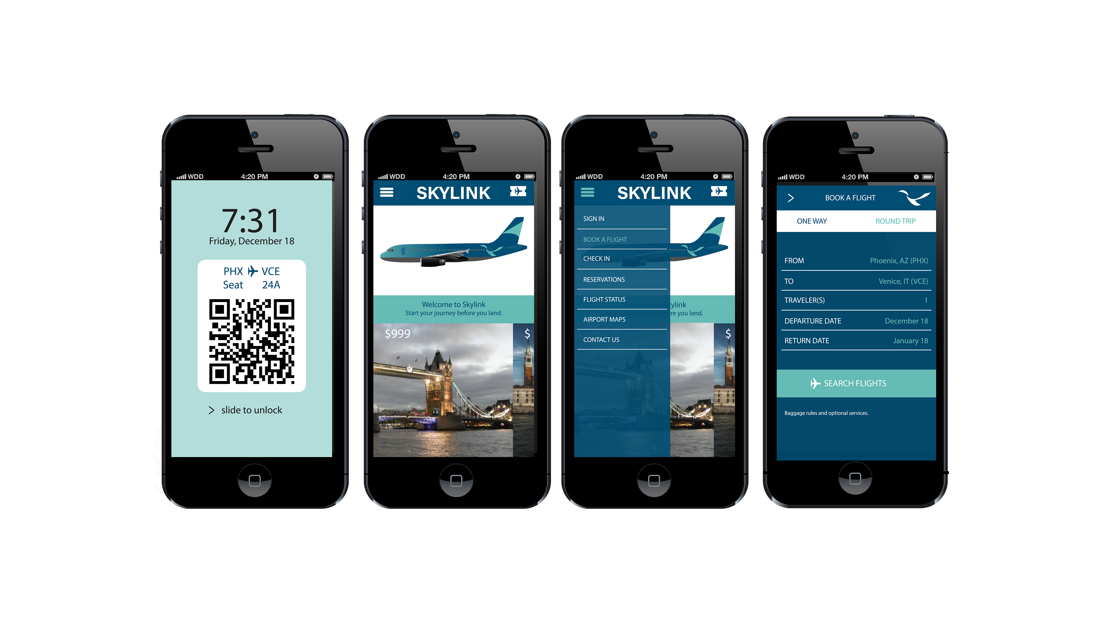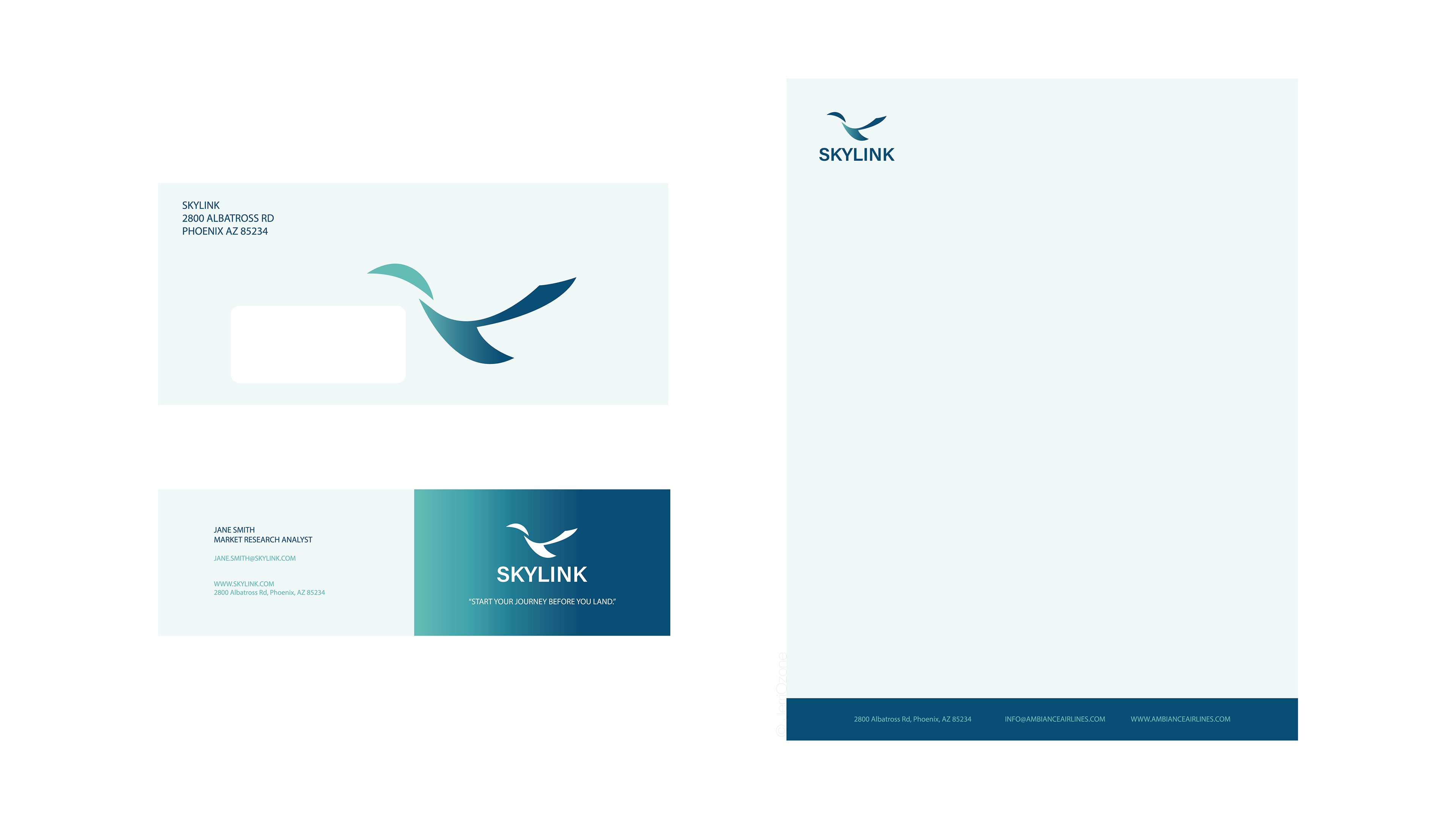Skylink is a fictional airline company. Included in this project are the logo, business system, various brand applications, and an app interface.